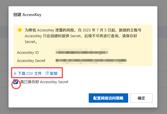 2)勾选我确认知晓云账号 AccessKey 安全风险协议并点击确认“继续使用云账号 AccessKey”按钮进入下一步操作;