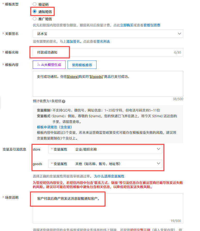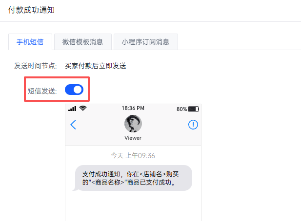 2.开启付款成功通知短信,复制“支付成功通知,你在${store}购买的“${goods}”商品已支付成功。”