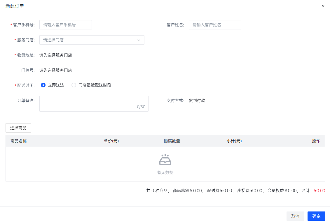 新建订单是提供未注册客户及主动为客户下单的模块,在新建订单下客户手机号、服务门店、收货地址、配送时间及配送商品为必填项,在首次为未注册用户成功下单后,系统将会记录客户联系方式及下单商品,以便往后下单时可迅速填充整个表单,匹配数据关键节点为客户手机号。如启用消息设置下的代客下单通知后,在发起订单的同时,商户将会以短信的方式通知客户订单下单成功通知,如未配置通知将不会发送。