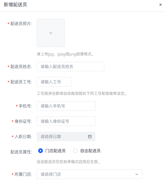 1)添加配送员:配送员照片、配送员姓名、工号、手机号、身份证号、入职日期及所属门店为必填项,配送员分门店配送员和自由配送员属性,当选择门店配送员时,需绑定归属门店,表示该配送员只能接受所绑定门店的订单派单;当选择自由配送员时,表示该配送员不归属任何门店,可以在当前店铺所开设的服务行政区域内接收任意来自客户的订单行为(自由配送员仅存在抢单模式下可执行接单操作);