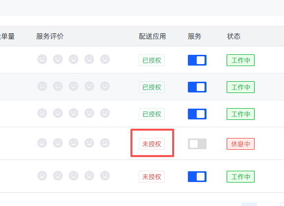 配送员列表中的状态栏分为工作中和休息中,工作中表示配送员可接收订单任务(但不代表能完全接收订单推送,此时需要配送员未关闭配送端应用且保持配送端应用在后台进程活动),休息中表示配送员无法接收订单任务。