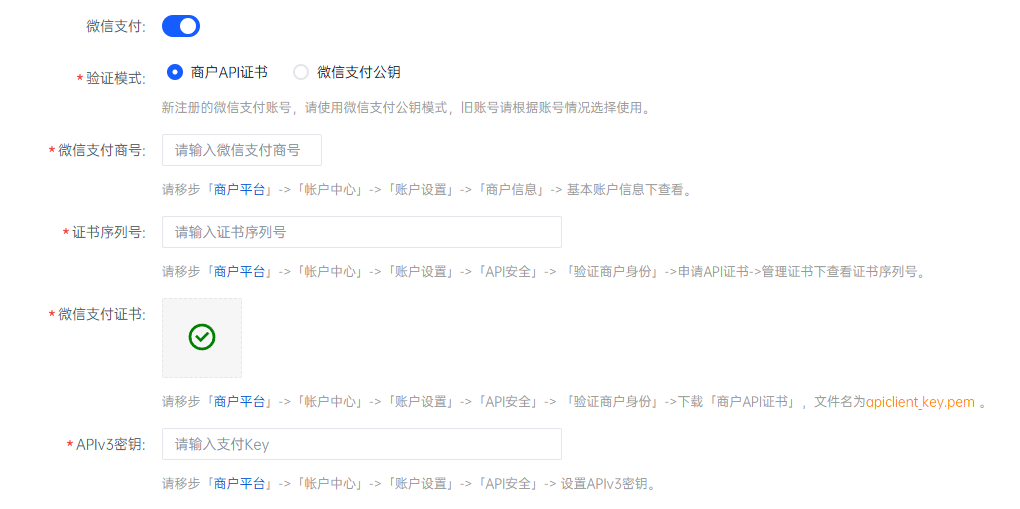 2)微信支付公钥模式:新注册微信支付的商户可选用(替代原平台证书模式);