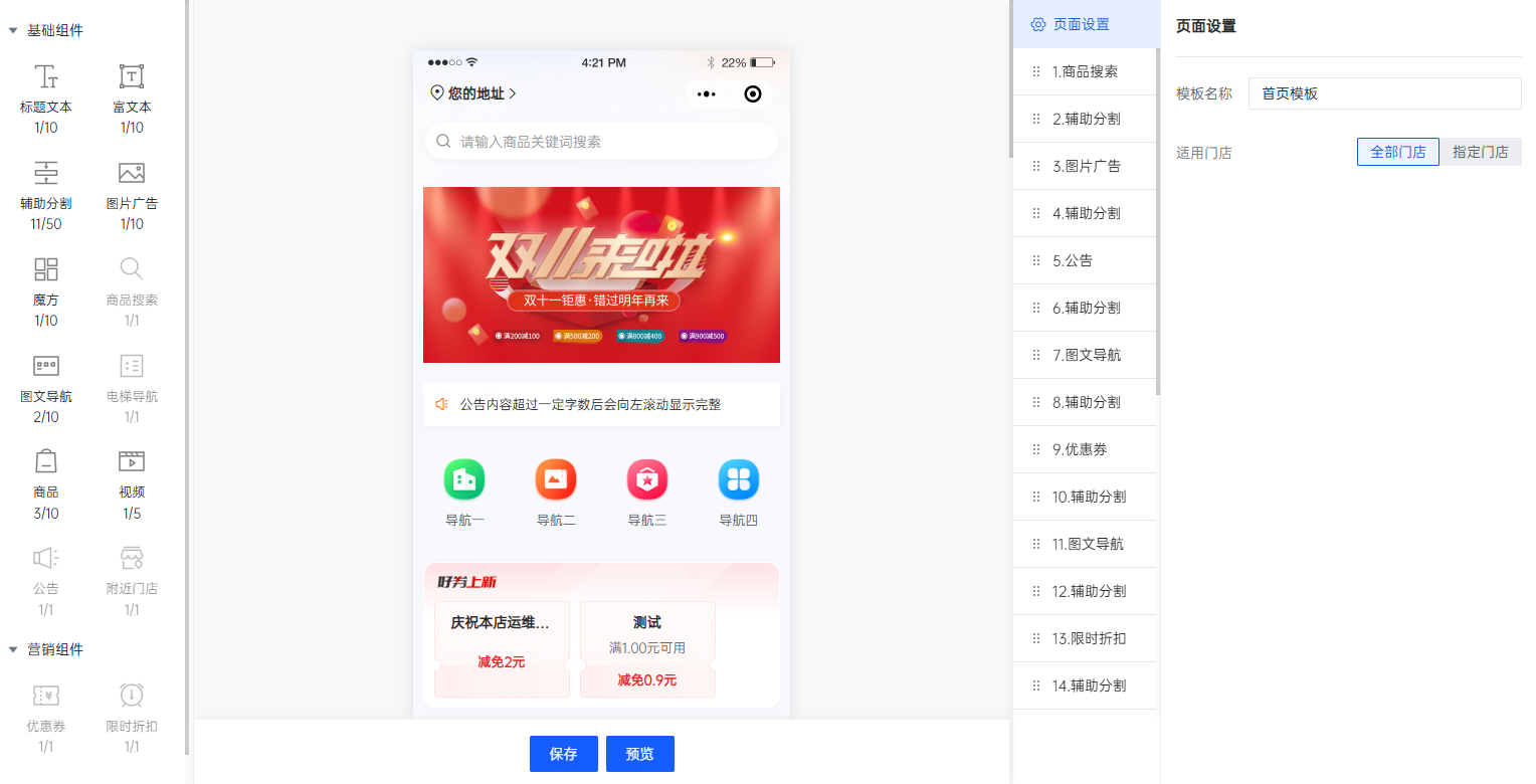 目前装修模块下提供了基础组件12个、营销组件2个,商户可根据业务开展来搭建自己的商城首页,也可为多门店搭建不同的首页显示方式。